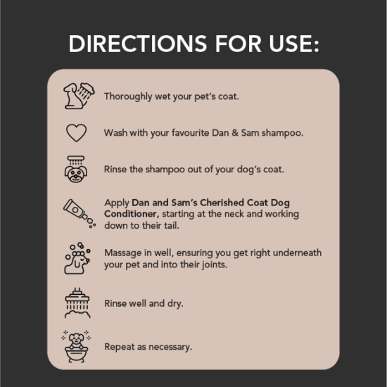 The Dan & Sam Cherished Coat Dog Conditioner is a vitamin enriched dog conditioner which helps to detangle and replenish moisture in your dog’s coat. Made using a mild formulation designed to be gentle on the skin, the Cherished Coat Conditioner is suitable for all dogs from six weeks and up. The Cherished Coat Dog Conditioner is enriched with pro-vitamin B5 that helps to maintain a soft, shiny and healthy coat.
