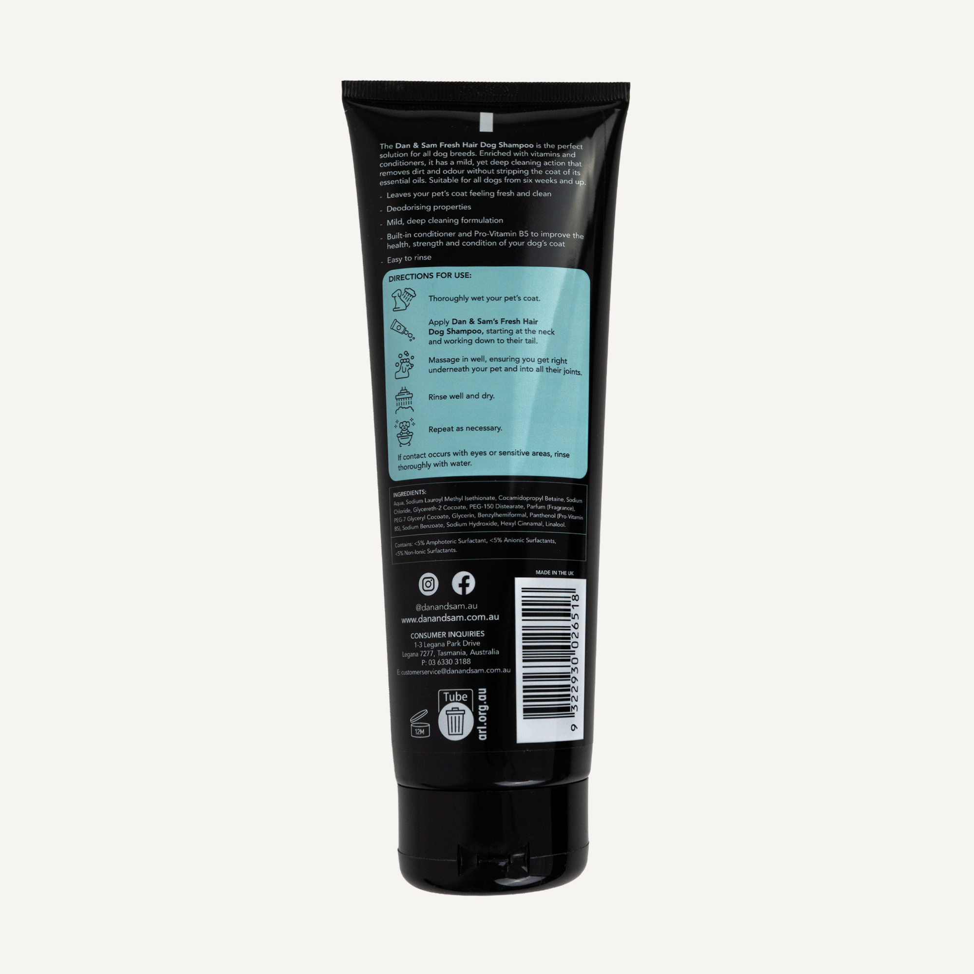 The Dan & Sam Fresh Hair Dog Shampoo has a deodorising, conditioning and cleaning formulation, perfect for all dog breeds. Suitable for all dogs from six weeks and up, including those with sensitive skin, the Fresh Hair Dog Shampoo has a mild, yet deep cleaning action that removes dirt and odour without stripping the coat of its essential oils, leaving your dog smelling and looking as fresh as can be. The Fresh Hair Dog Shampoo also contains a built-in conditioner and Pro-Vitamin B5 that leaves your dog’s coat beautifully clean and healthy. With an ‘easy rinse’ formulation, washing time is kept to a minimum, while the built-in conditioner and Pro-Vitamin B5 help to improve the health, strength and condition of your dog’s coat.