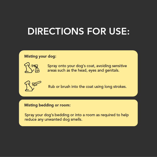 For use as a dog deodoriser, spray onto your dog’s coat, avoiding sensitive areas such as their head, eyes and genitals. Rub or brush into their coat using long strokes.