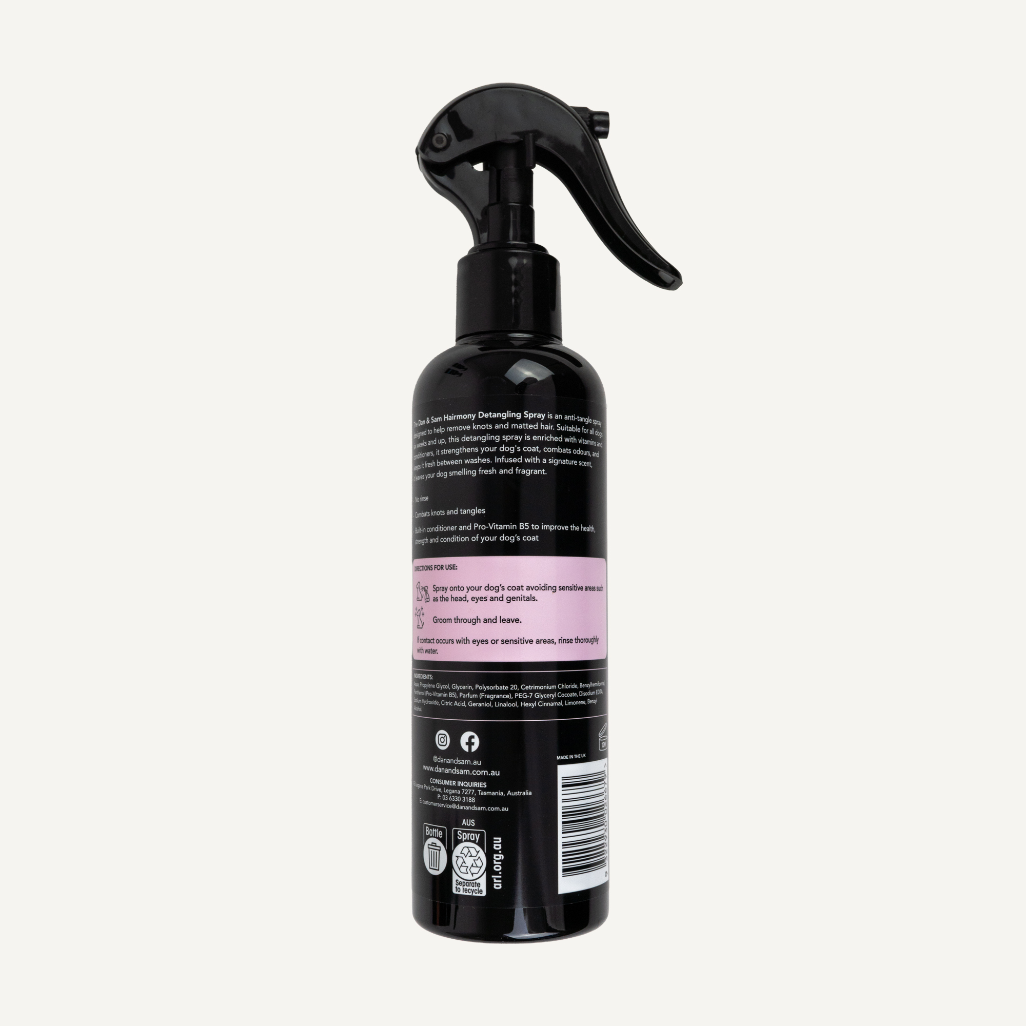 The Dan & Sam Hairmony Detangling Spray is a specially formulated, anti-tangle product designed to remove knots, tangles and matted hair. Simply spray on your dog’s coat and groom through. The Dan & Sam Hairmony Detangling Spray is a leave-in dog spray, enriched with vitamins and conditioners to help maintain the health, strength and condition of your dog’s coat, whilst combatting nasty odours and keeping your dog’s coat fresh and clean in between washes. Infused with a delightful signature scent, this leave-in spray is ideal for reducing odours and removing tangles, leaving your dog smelling fresh and fragrant for longer.